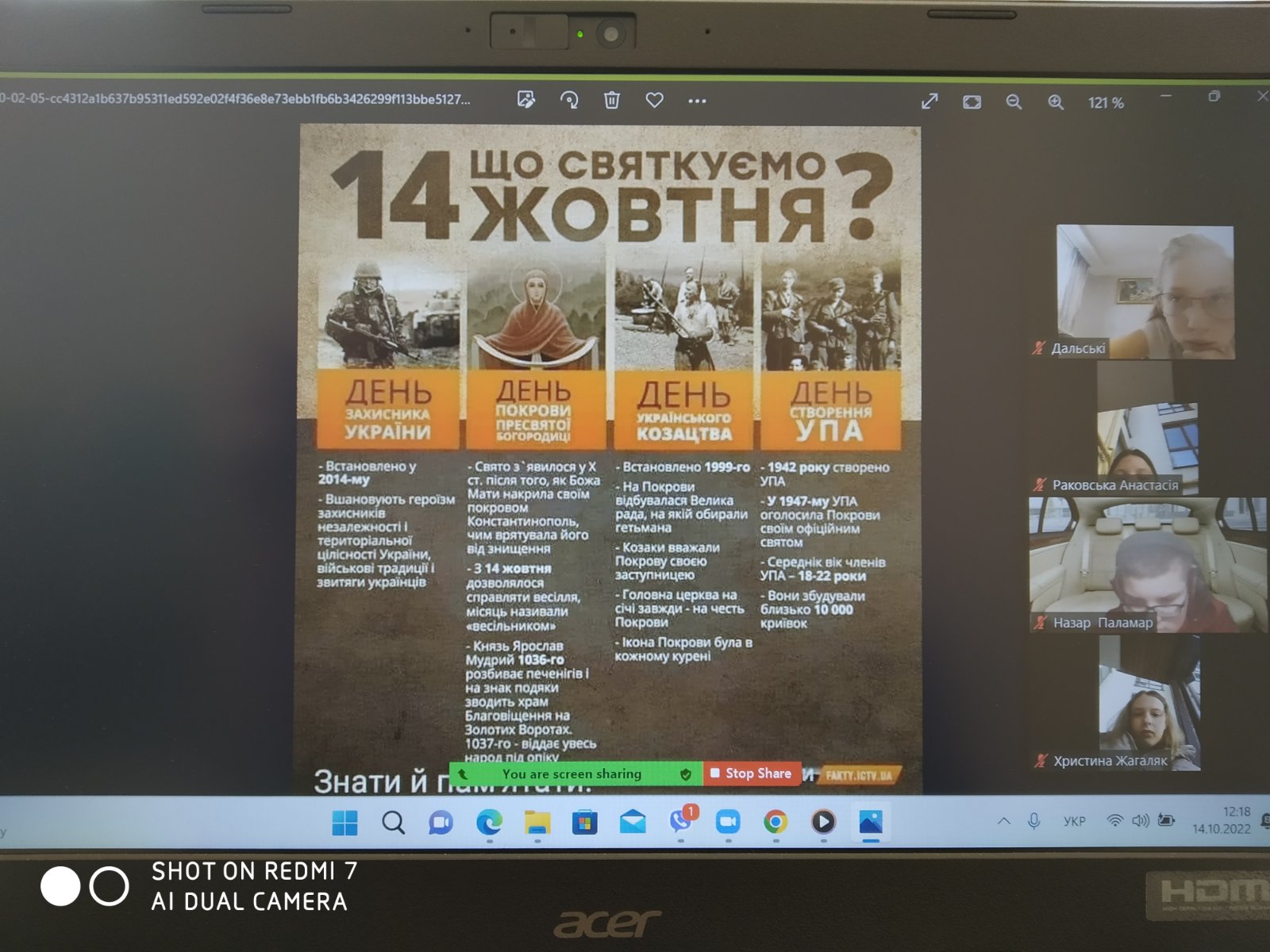 До дня 80річчя УПА та захисників (захисниць) України у 7-Б класі проведено виховну годину,на якій діти переглянули документальний фільм про історію УПА та провели паралель між тим,що відбувалося в минулому та сьогоденням. Класний керівник: Ольга Терес.