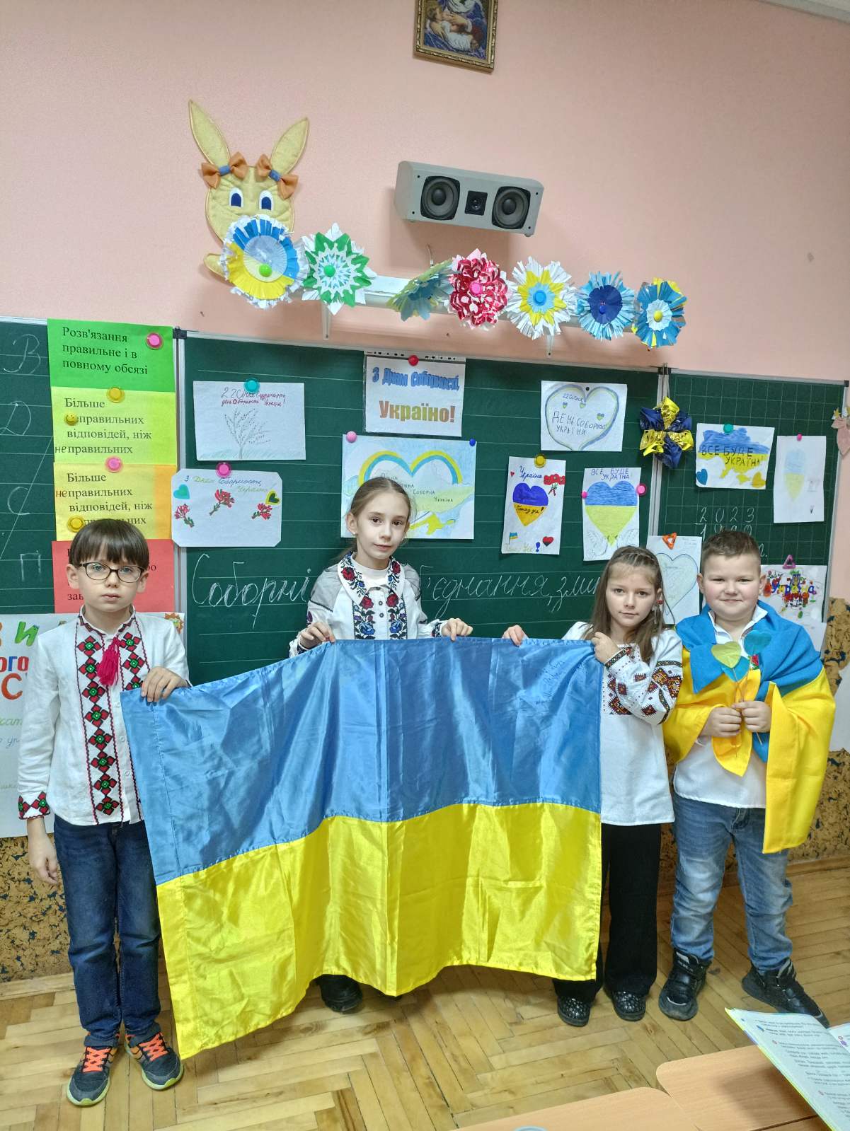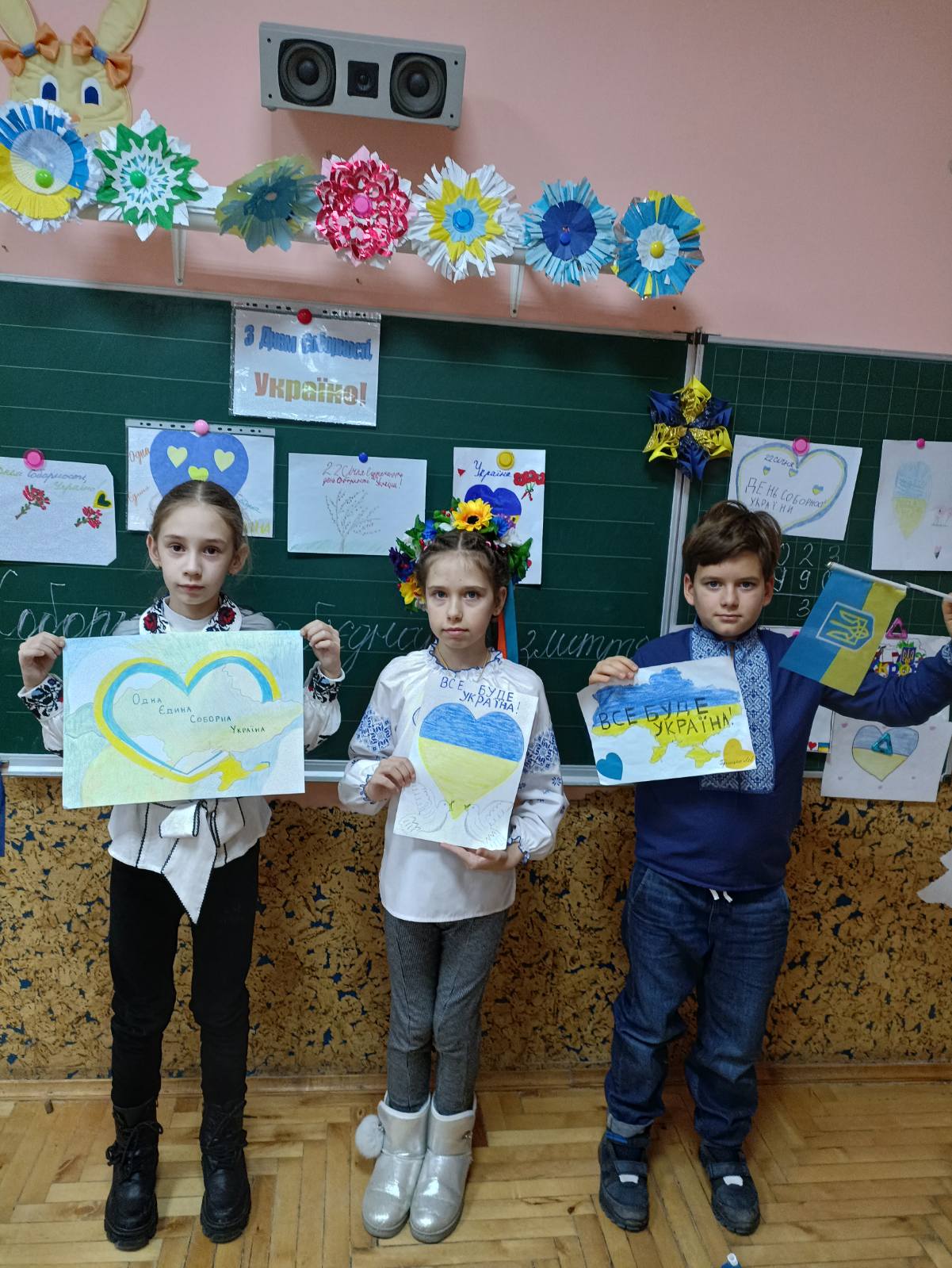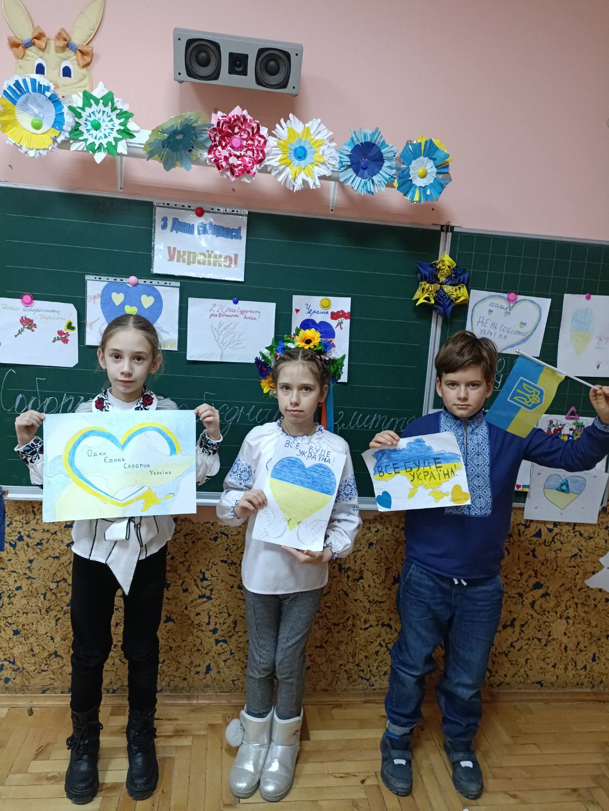 ,,державність” та ,,незалежність”,історією свята Дня Соборності.Виконали вправу,,Діти єднають Україну”, створили,,Ланцюг єдності” і виконували пісні про Україну.