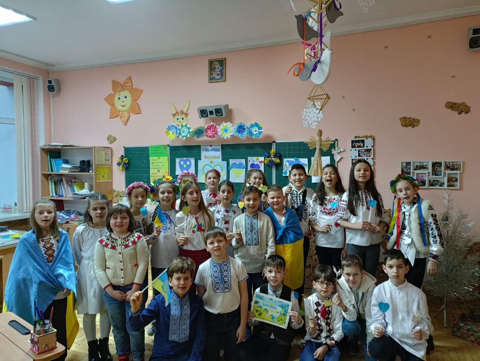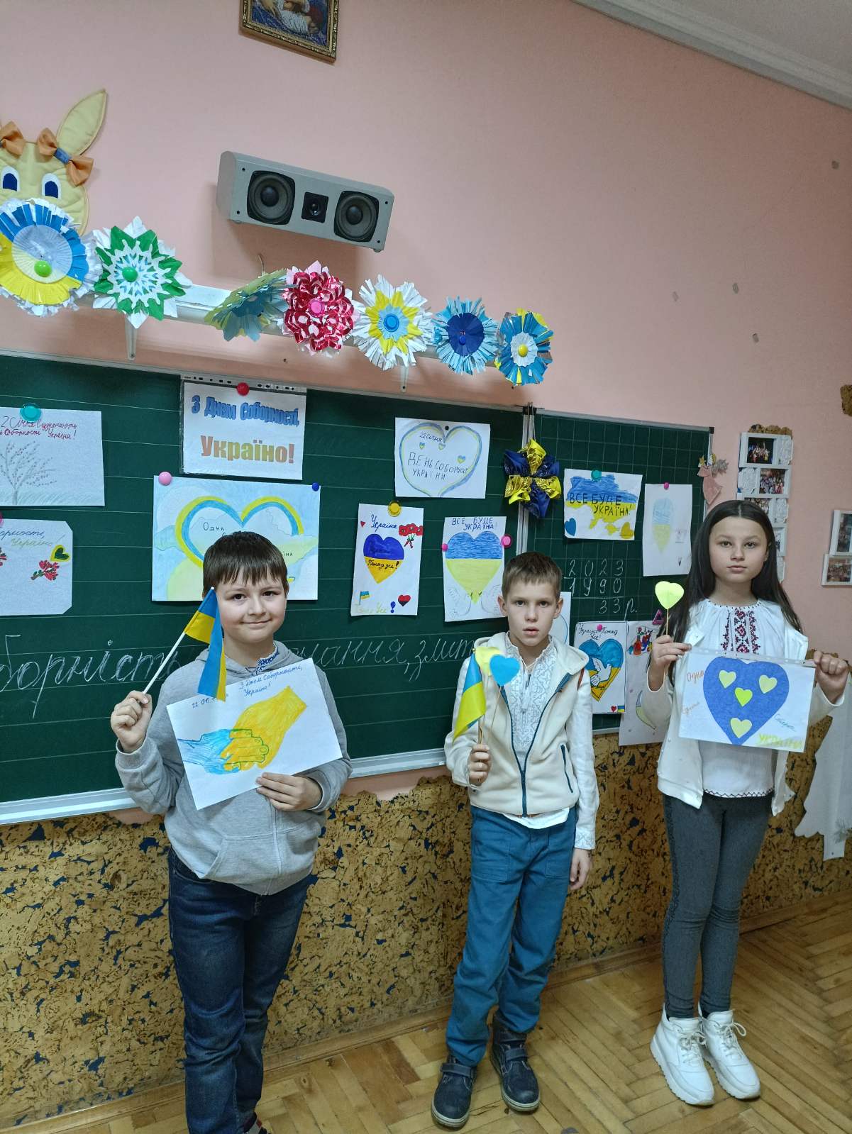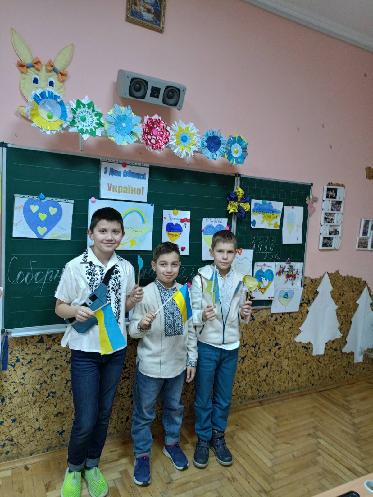 ,,державність” та ,,незалежність”,історією свята Дня Соборності.Виконали вправу,,Діти єднають Україну”, створили,,Ланцюг єдності” і виконували пісні про Україну.