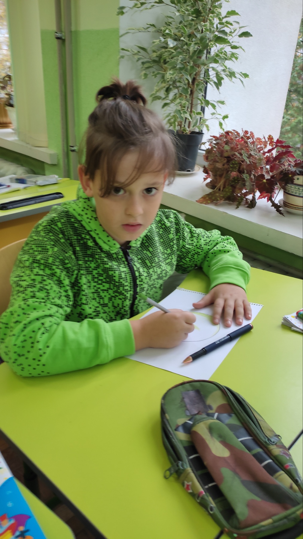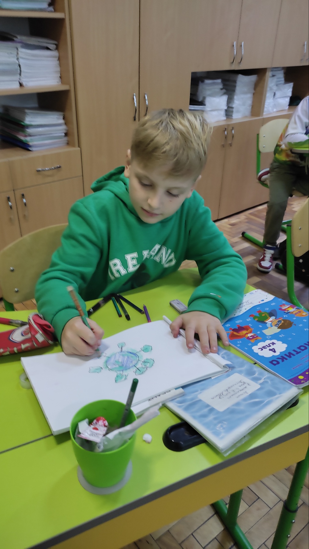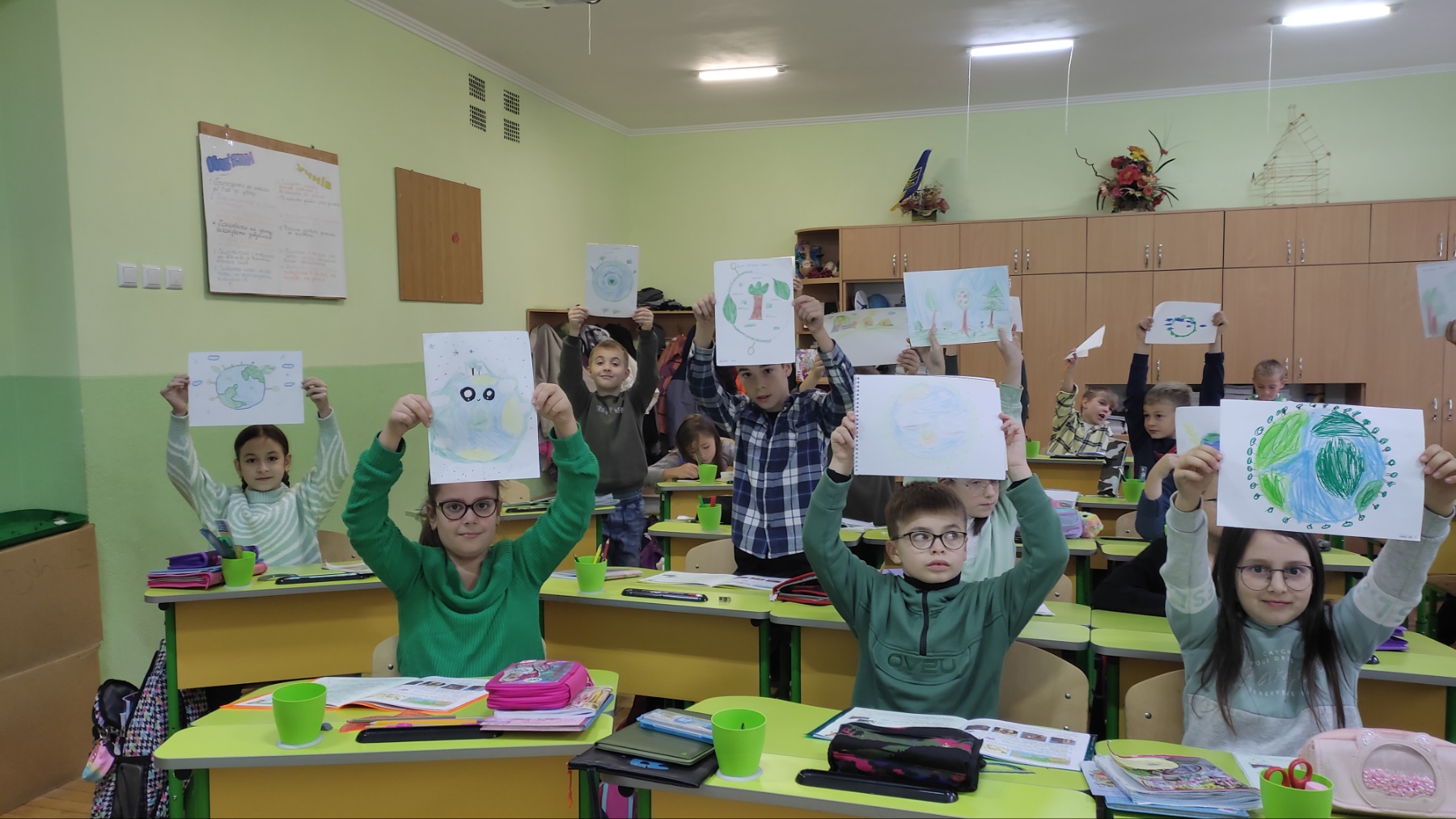 А який чудовий та неповторний зелений колір… Це день довкілля, надії, безпеки, юності, спокою. Зелений колір – скромний, спокійний, вологий, м’який. Це колір природи, рослин. Без них неможливе життя, вони своїм корінням йдуть в землю, а листям тягнуться до неба. Це колір природної гармонії. Він дає нам відчуття спокою, розслаблення… Учні 4-Б класу разом з кл.керівником Світланою Кравець долучилися до святкування Кольорового тижня. На ранковій зустрічі створили цікаві малюнки з теми ” Живи в гармонії з природою”.
