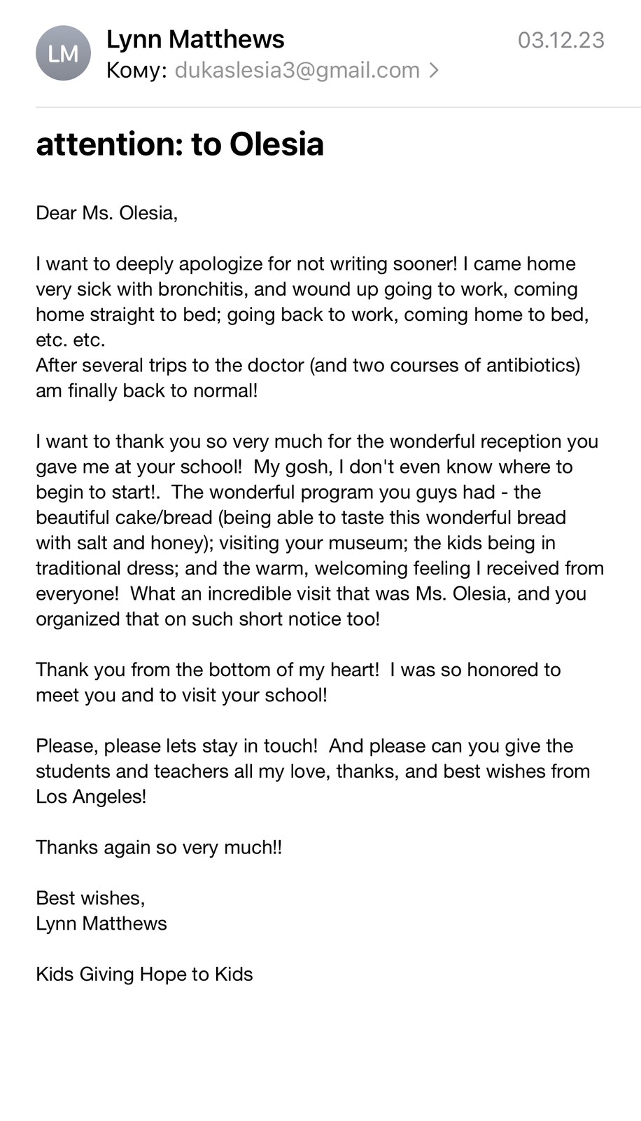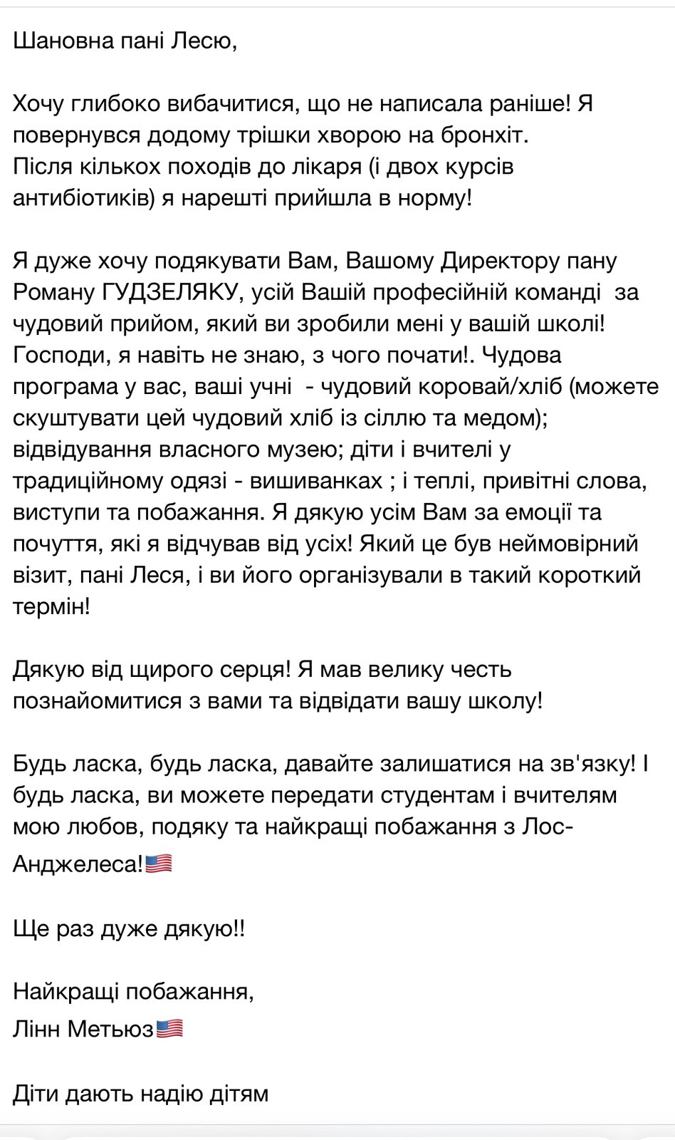 Цими днями отримали різдвяний email- подяку із США про міжнародну зустріч, яка відбувалась у листопаді 2023 року у НВК «СЗШ2- гімназія», яка мала честь приймати Делегацію з Америки в особі Мrs Lynn Matthews із штату Каліфорнія, Лос Анджелес. Благодійна організація “Kids Giving Hope to Kids”, керівником якої є Міс Lynn у США, знайшла сайт нашої школи онлайн та зателефонувала директору Роману ГУДЗЕЛЯКУ, щоб домовитись про зустріч. Мета даного візиту була допомога дітям, які живуть в умовах війни, Меседж Миру та Надіі на щасливе майбутнє, а саме в Україні, Сирії та Ізраїлі. Учні 7-Б класу разом із класним керівником Лесею ДУКАС гідно зустріли американську делегацію хлібом-сіллю за українським звичаєм. Провели чудову англомовну екскурсію школою та завітали із Міс Lynn до етномузею “Оселя”, де їх чекали господар Олександр БАЙДАЦЬКИЙ та господиня Марія МІЛЬКОВИЧ із цікавим представленням українських звичаїв та традицій. «Україна та Українці – це високоінтелектуальна нація Нескорених . Країна Героїв та Милосердя», – сказала Міс Matthews. Усі малюнки наших дітей, які несли єдине бажання миру та образ Святого Миколая були доставлені у США, а Міс Лін і надалі донатить та просить уряд Америки ще більше допомагати Україні, щоб перемога настала якнайшвидше!!!🇺🇸