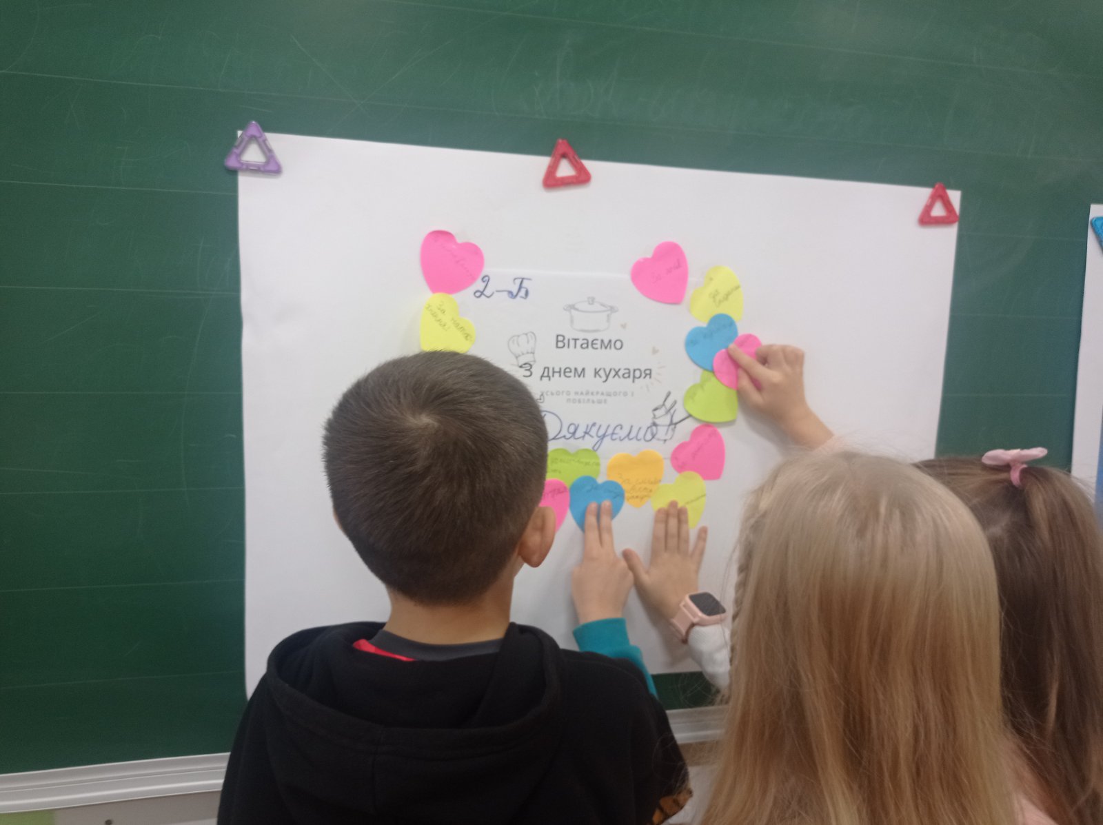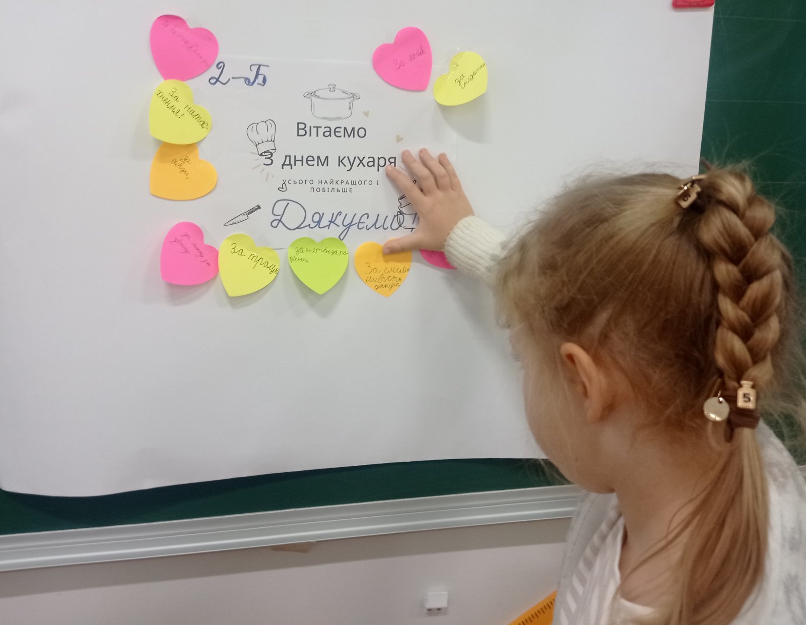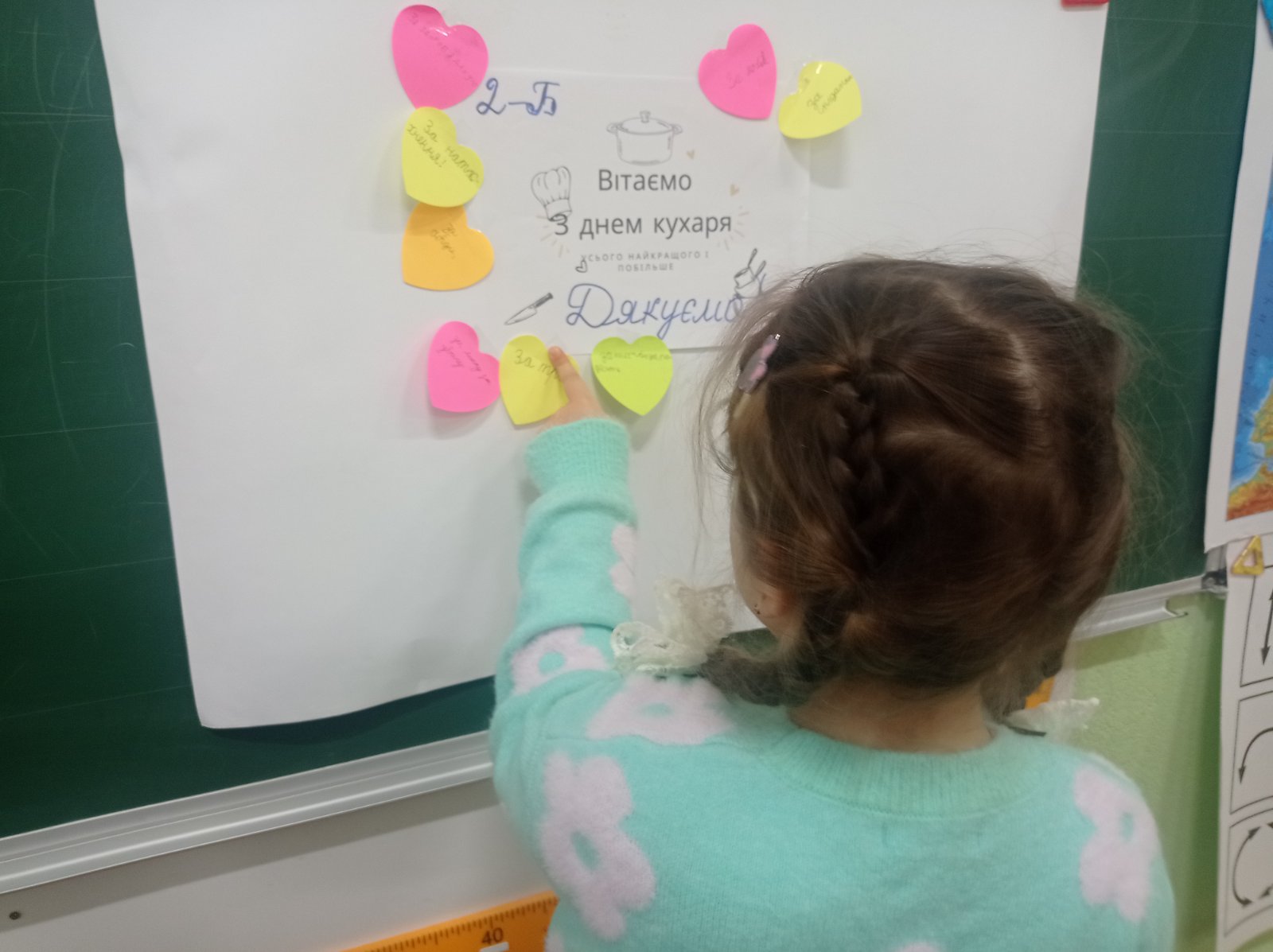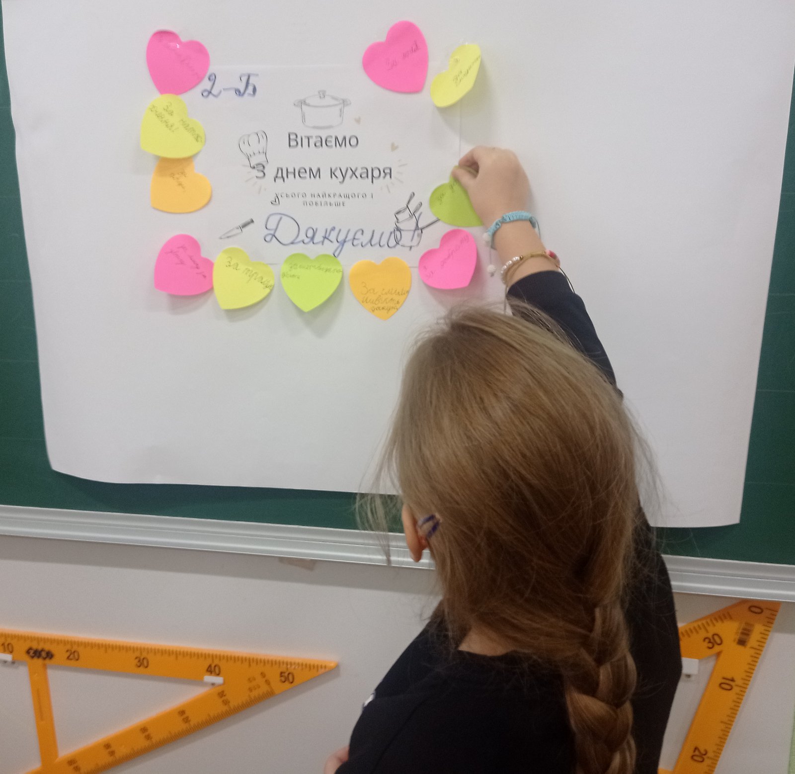 На ранковій зустрічі учні 2-Б класу виявили щире бажання висловити подяку нашим шкільним кухарям. Діти написали теплі слова вдячності на різнокольорових серцях.