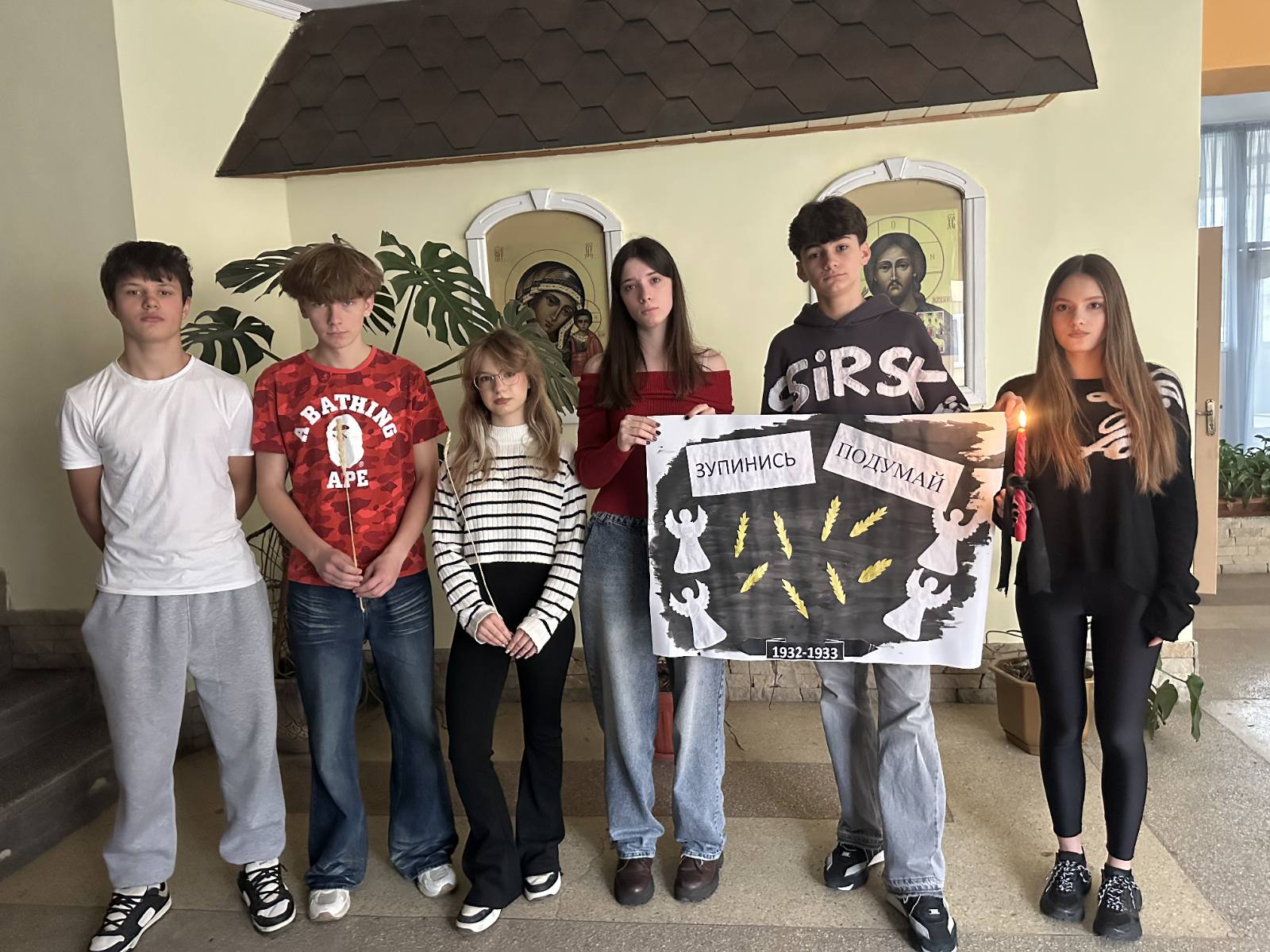 Учнівський парламент школи вшанував пам’ять жертв Голодомору 1932–1933 років. Чорний фон — символ скорботи, золоті колоски – знак зламаного життя, силуети ангелів – уособлення невинних душ мільйонів загиблих.