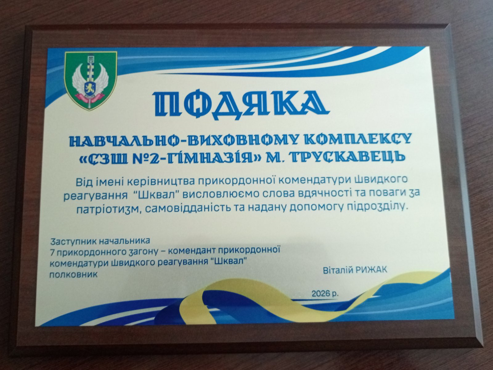 На знак вдячності за небайдужість 7 прикордонний Карпатський загін передав НВК «СЗШ№2-гімназія» підписаний державний прапор та офіційну Подяку.